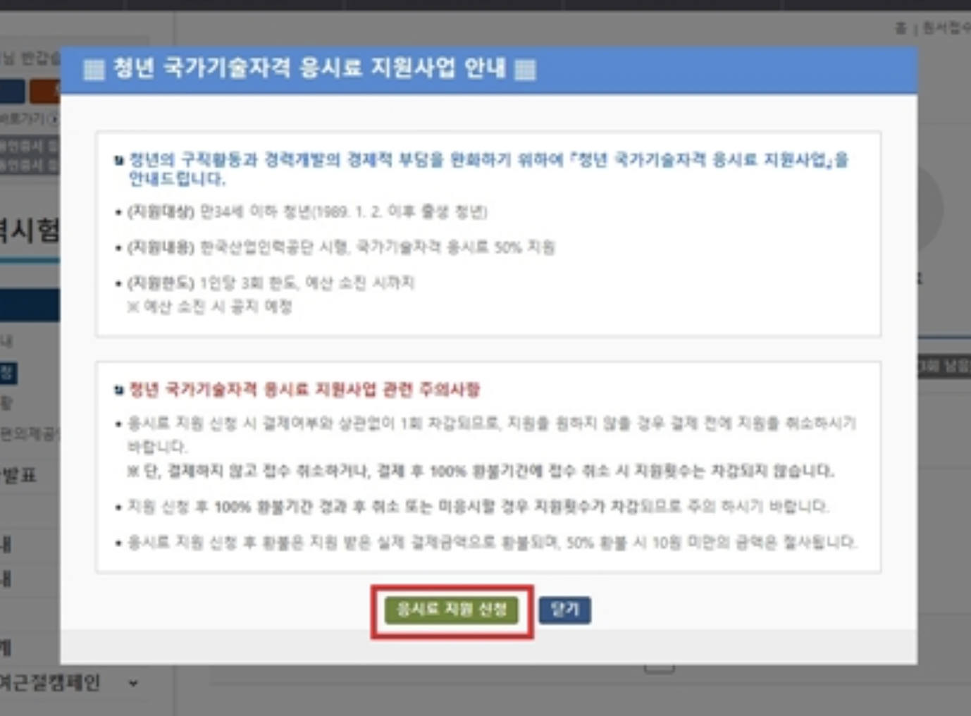 유의사항이 포함된 팝업이 아래와 같이 뜨게 되면 [응시료 지원 신청]을 누릅니다.