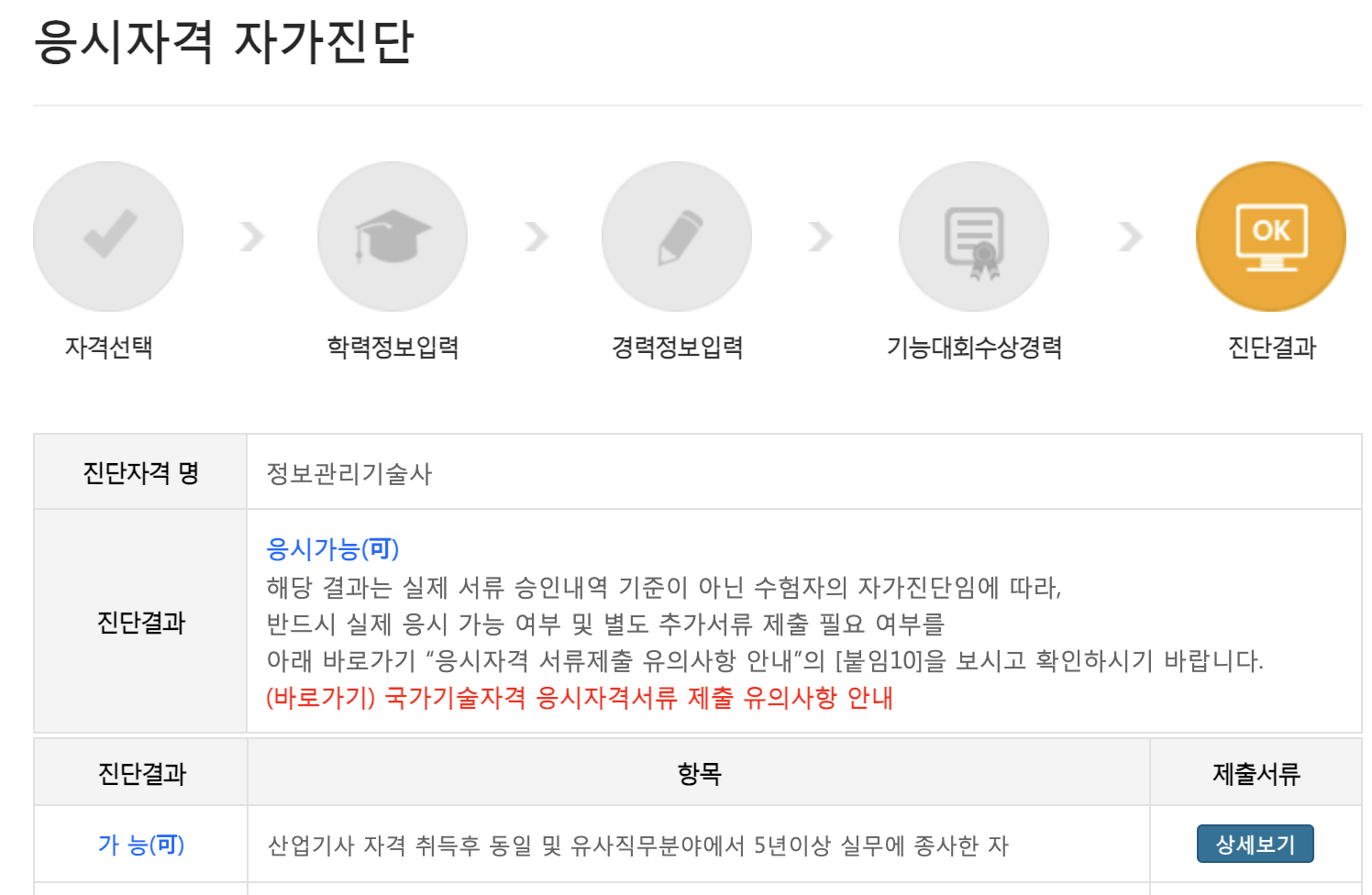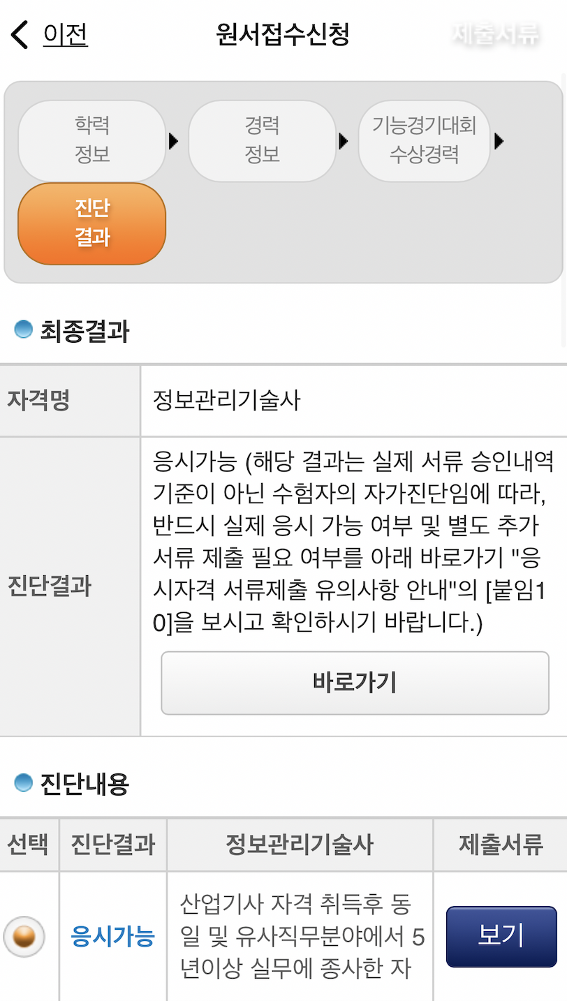 4. 진단결과를 확인하고, 응시가 가능하면 제출서류를 확인합니다.