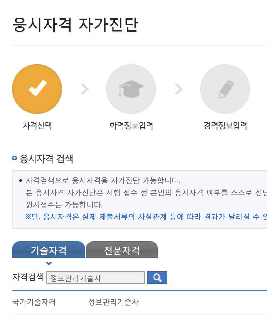3. 원하는 자격증을 검색한 후 클릭한 다음 [학력정보]와 [경력정보]를 작성해줍니다.