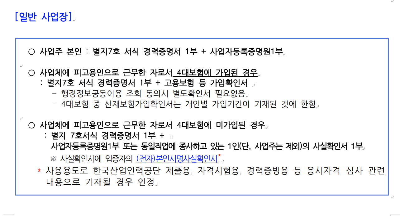 경력증명서 + 해당 사업자 등록증명원 (또는 동일 직업 종사중인 1인의 사실확인서)